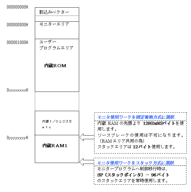 ユーザスタックエリアをモニタワークの方式に応じて、スタックエリアの確保に考慮してください。 |